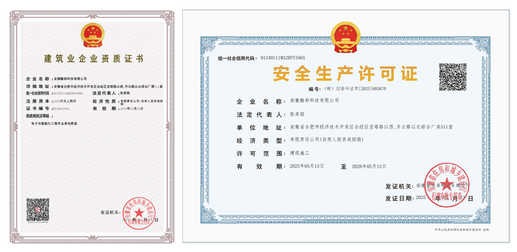 在公司发展的重要节点上,安徽酷部科技有限公司迎来双重喜讯 —— 成功取得建筑行业电子与智能化工程专业承包二级资质以及安全生产许可证!这两项资质的获得,标志着酷部科技在综合实力和安全生产管理方面实现重大跨越,是公司发展史上的重要里程碑。